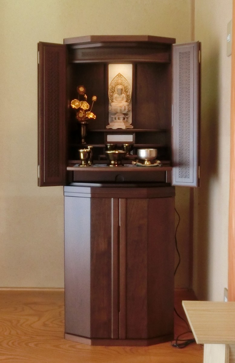 川崎市高津区 O様 2025/01/08 仏壇名 国産 クルミ材台付仏壇 サイズ 高さ119×巾44×奥行33(㎝) お仏壇紹介 扉のレーザー彫りが特徴的な国産仏壇です。 特徴的なデザインと落ち着いた雰囲気が融合した、洋室にも和室にも違和感なく設置できます。 綺麗にお納めすることが出来ました。
